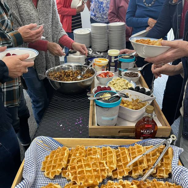The women were treated to a fantastic breakfast spread of homemade granola, English muffins with bacon and eggs, waffles with all manner of toppings and tea and coffee (Ruth made gluten-free muffins which can’t be bought at local stores). People enjoyed getting to know women of all ages including visitors from other church denominations, and friends and family members who did not normally attend church.